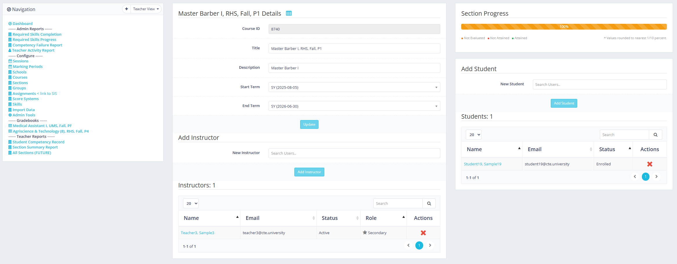 Revolution is a modern, web-based Career & Technical Education (CTE) management platform developed by educators, for educators. Built as a replacement for a retired competency-tracking system, Revolution uses a modern technology stack and scalable database architecture capable of supporting tens of thousands of teachers, sections, and student enrollments while maintaining long-term archives to meet state and federal retention requirements. Using state-approved competencies and tasks, educators can easily score and track student progress in real time, reducing paperwork and allowing more time for instruction. Beyond competency tracking, Revolution is being designed to manage the entire lifecycle of a CTE student—from program entry, through completion, into post-program outcomes, and even back as business partners offering internships or employment opportunities.